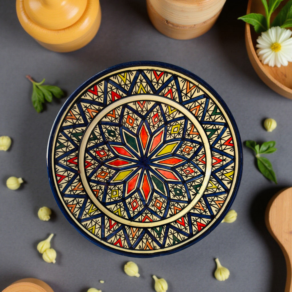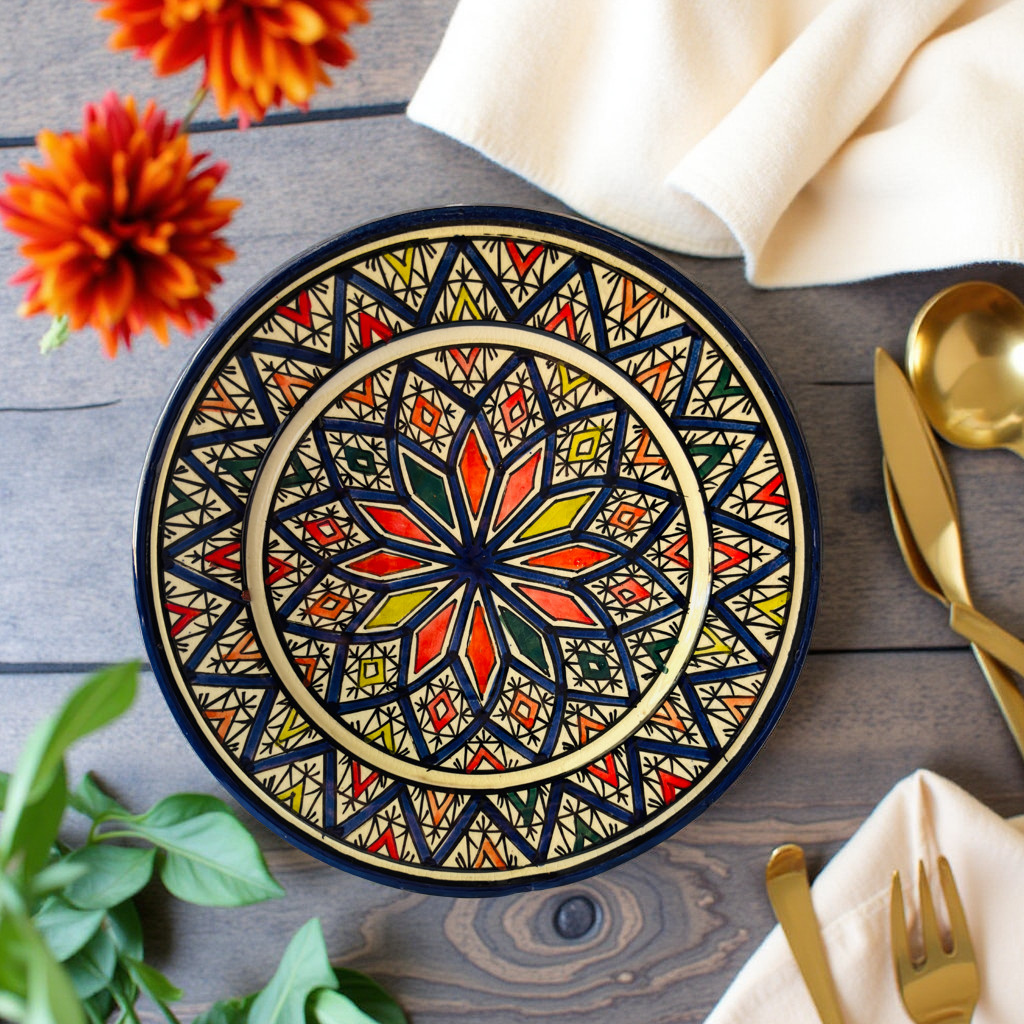 Infuse your home with bold color, culture, and craftsmanship with the “Midnight Medina Radiance” — a stunning hand-painted ceramic plate that echoes the spirit of Moroccan architecture and geometric tilework. Handmade in the historic city of Safi, this terracotta dish is a celebration of Moroccan artistry and makes a statement whether used for entertaining or displayed as décor.